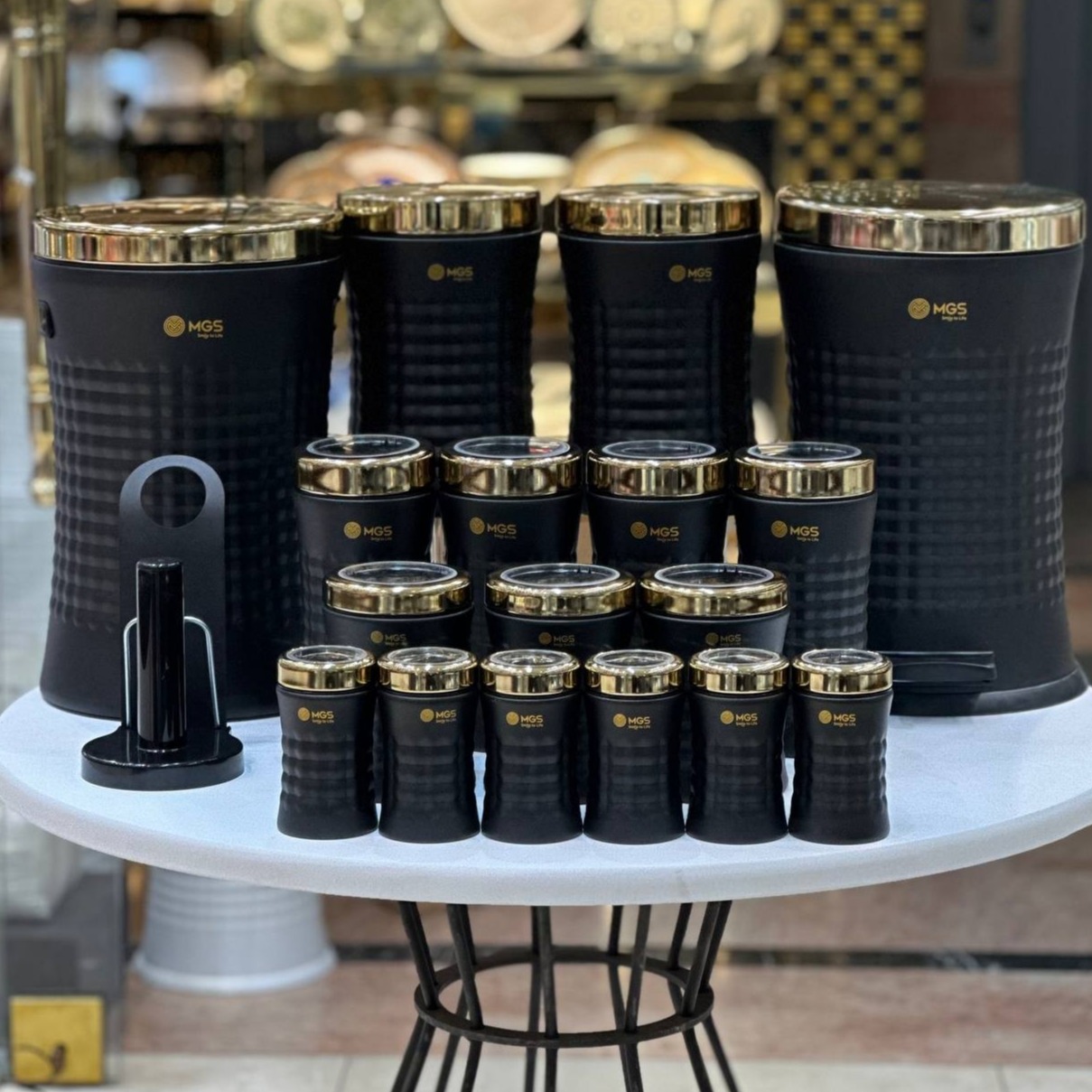 سرویس آشپزخانه 18 پارچه کریستالی مشکی سنباده ای درب طلایی - ام جی اس