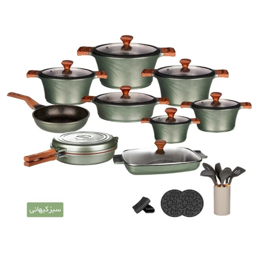 قابلمه سایز ۱۶ – ۲ نفره ، وزن: ۹۰۰ گرم قابلمه سایز ۲۰ – ۴ نفره ، وزن: ۱۳۰۰ گرم قابلمه سایز ۲۴ – ۶ نفره ، وزن: ۱۷۵۰ گرم قابلمه سایز ۲۸ – ۸ نفره ، وزن: ۲۲۵۰ گرم قابمله سایز ۳۲ – ۱۲ نفره ، وزن: ۲۹۰۰ گرم تابه تکدسته سایز ۲۴ – ارتفاع ۴.۵ سانتیمتر ، وزن: ۷۷۵ گرم تابه دو دسته سایز ۲۸ – ارتفاع: ۷.۵ سانتیمتر ، وزن: ۲۱۰۰ گرم تابه دوبل گرد سایز ۲۸ – وزن: ۱۸۹۵ گرم فر تابه سایز ۳۶ هفت پارچه کفگیر و ملاقه سیلیکونی یک جفت زیر قابلمه سیلیکونی یک جفت دستگیره سیلیکونی